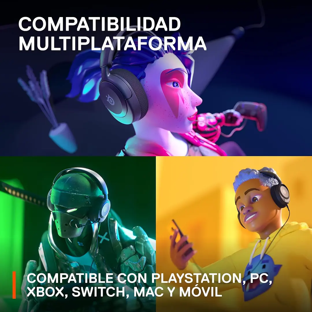 Compatibilidad multiplataforma: Arctis Nova 1X funciona con muchas plataformas, ya que la toma universal de 3,5 mm es compatible con PC, Mac, PlayStation, Xbox o Switch. También podrás vibrar sin parar cuando vayas de un lado a otro con tu móvil.