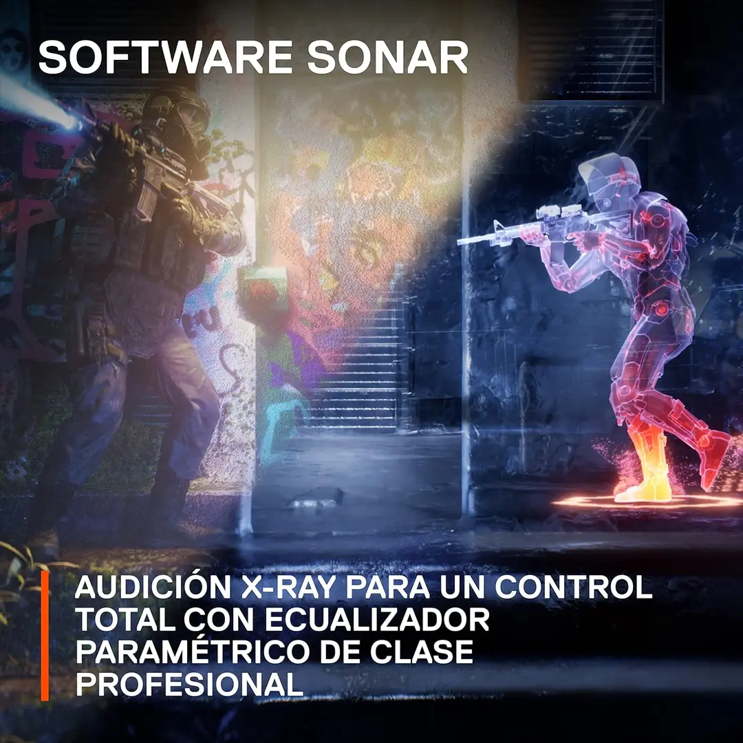 Ecualizador paramétrico de clase profesional: Siéntete un mago del sonido con el software Sonar y ajusta muchos aspectos del sonido utilizando un ecualizador paramétrico de 10 bandas de calidad profesional. Con un par de clics, resalta los saltos y las pisadas de los enemigos utilizando preajustes hechos con los mejores jugadores de esports.