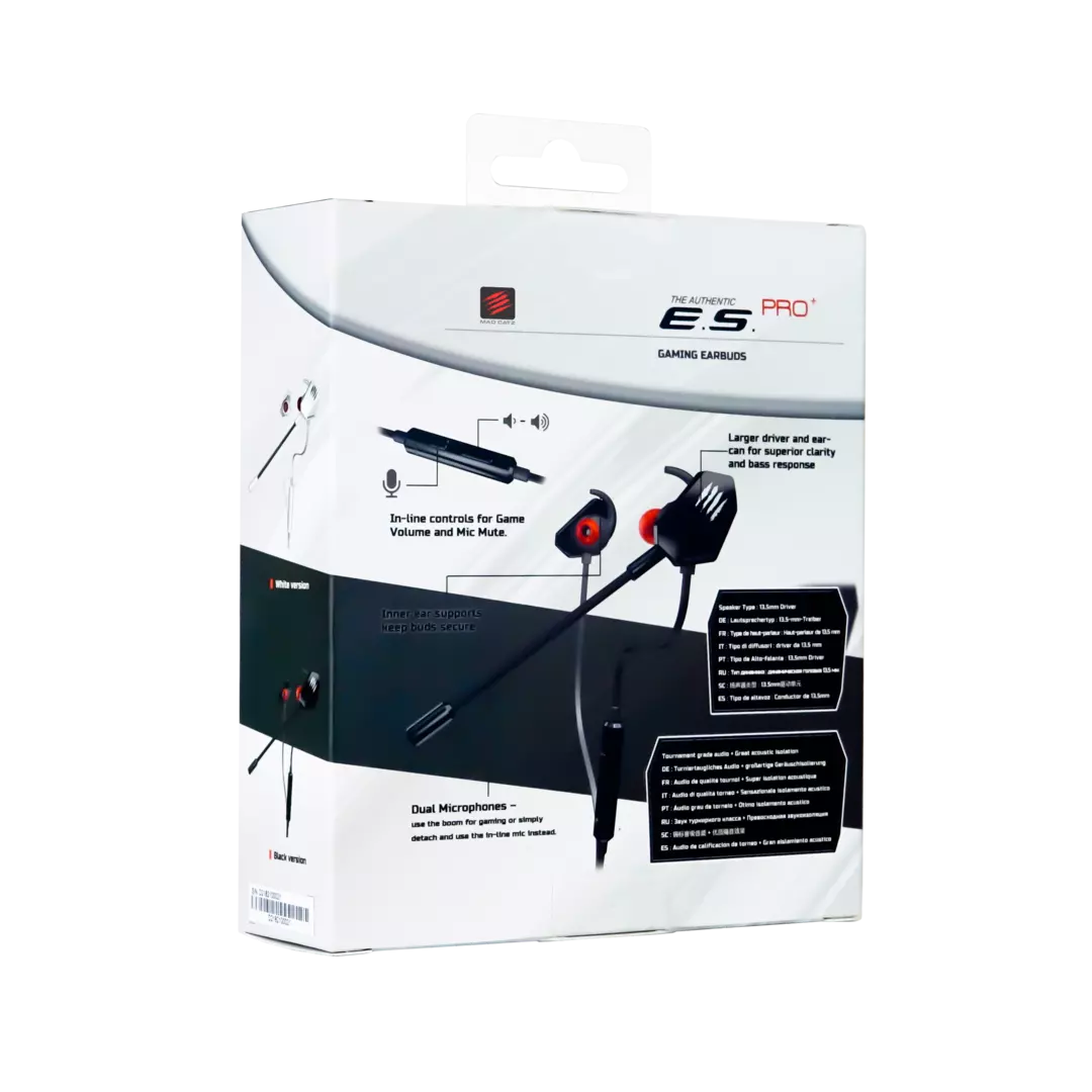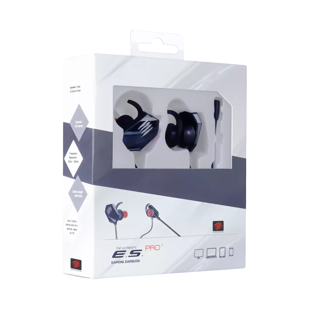 Los auriculares para juegos ES PRO + de Mad Catz incluyen el rendimiento de unos auriculares de tamaño completo para PC en un factor de forma pequeño. A diferencia de muchos auriculares para PC, ES PRO + es un auricular para jugadores que se puede conectar a teléfonos inteligentes, tabletas e incluso a controladores de consola de videojuegos domésticos. Los controladores de más de 13,5 mm brindan una calidad de sonido de categoría de torneo y dos micrófonos le brindan un control total sobre su chat en línea. Los auriculares para juegos ES PRO + brindan comodidad y hacen que las conversaciones con amigos y rivales en línea sean divertidas. También puede obtener su ajuste ideal reemplazando los auriculares incluidos. Además, el método del oído interno no cambia durante el juego, lo que le permite concentrarse en el juego.