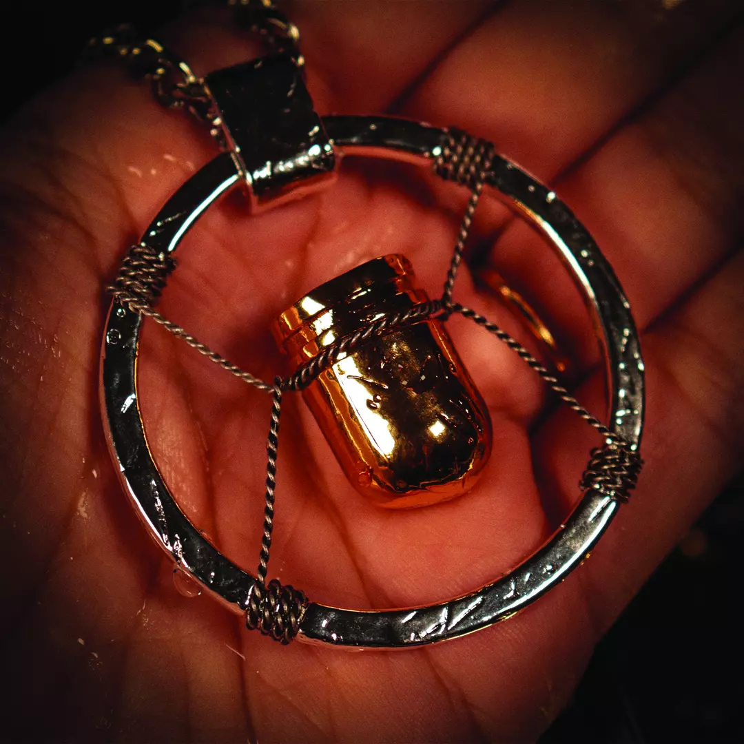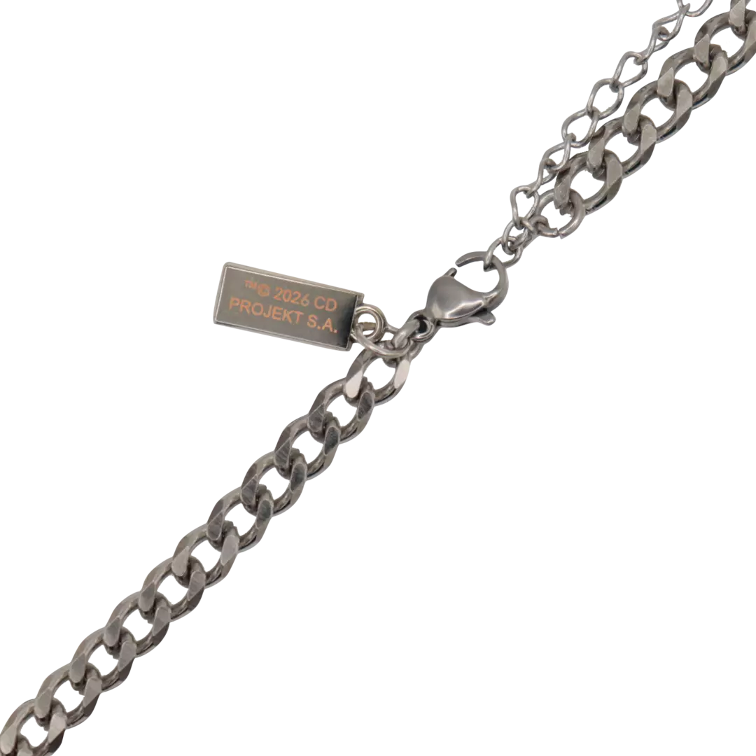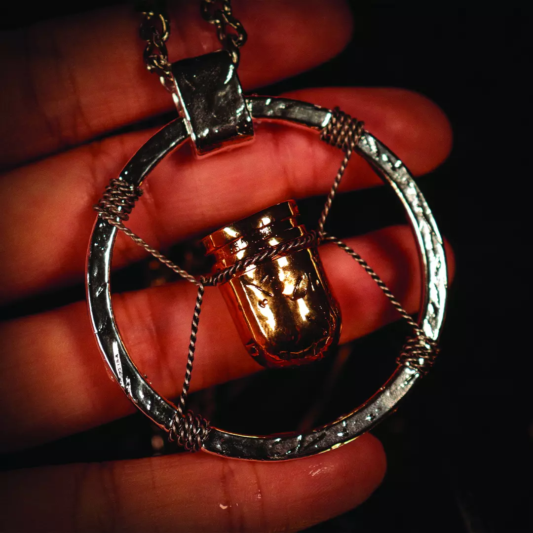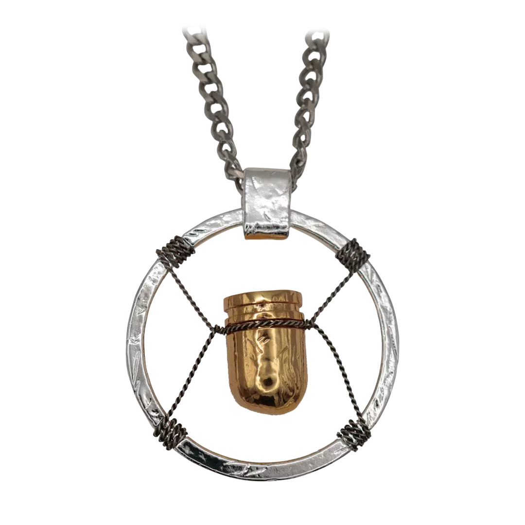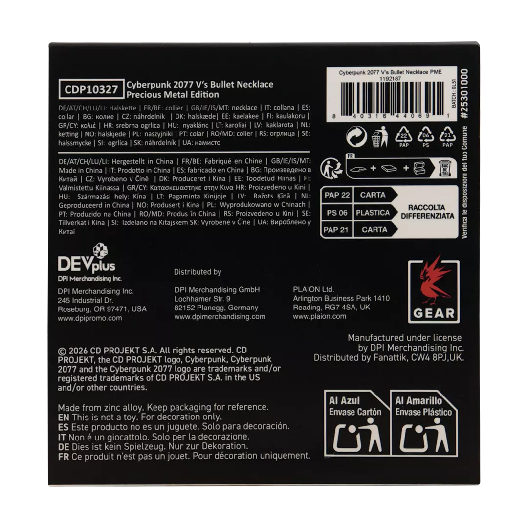 El icónico collar de V de Cyberpunk 2077 se presenta en esta réplica oficial con un diseño fiel y un acabado premium que captura la estética cruda y futurista de Night City. El colgante reproduce la bala característica del protagonista, suspendida dentro de un marco circular metálico que refuerza su simbolismo, mientras que la cadena aporta una presencia sólida y elegante. El contraste entre el dorado de la bala y el plateado del marco crea una pieza visualmente impactante y reconocible al instante para cualquier fan del universo Cyberpunk.