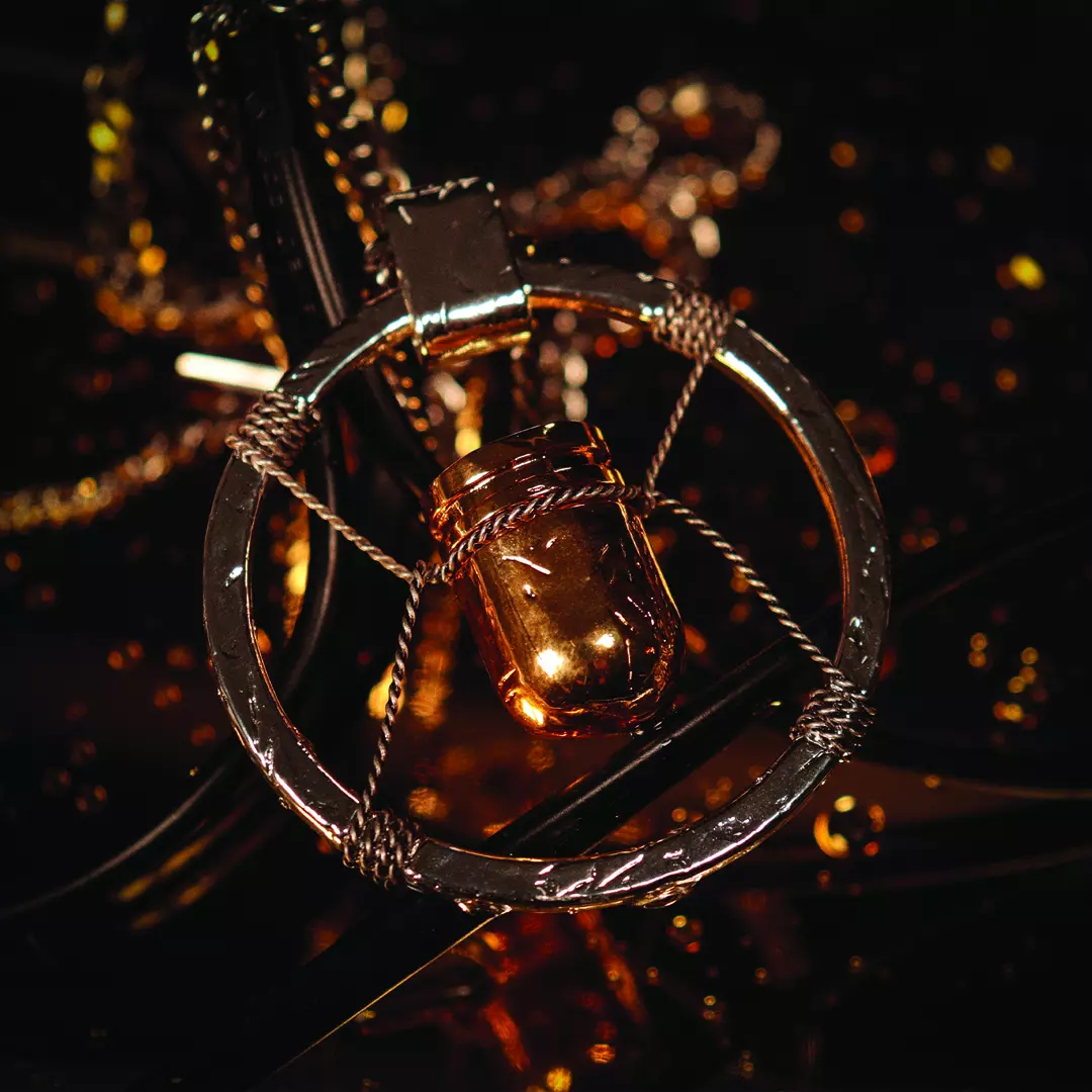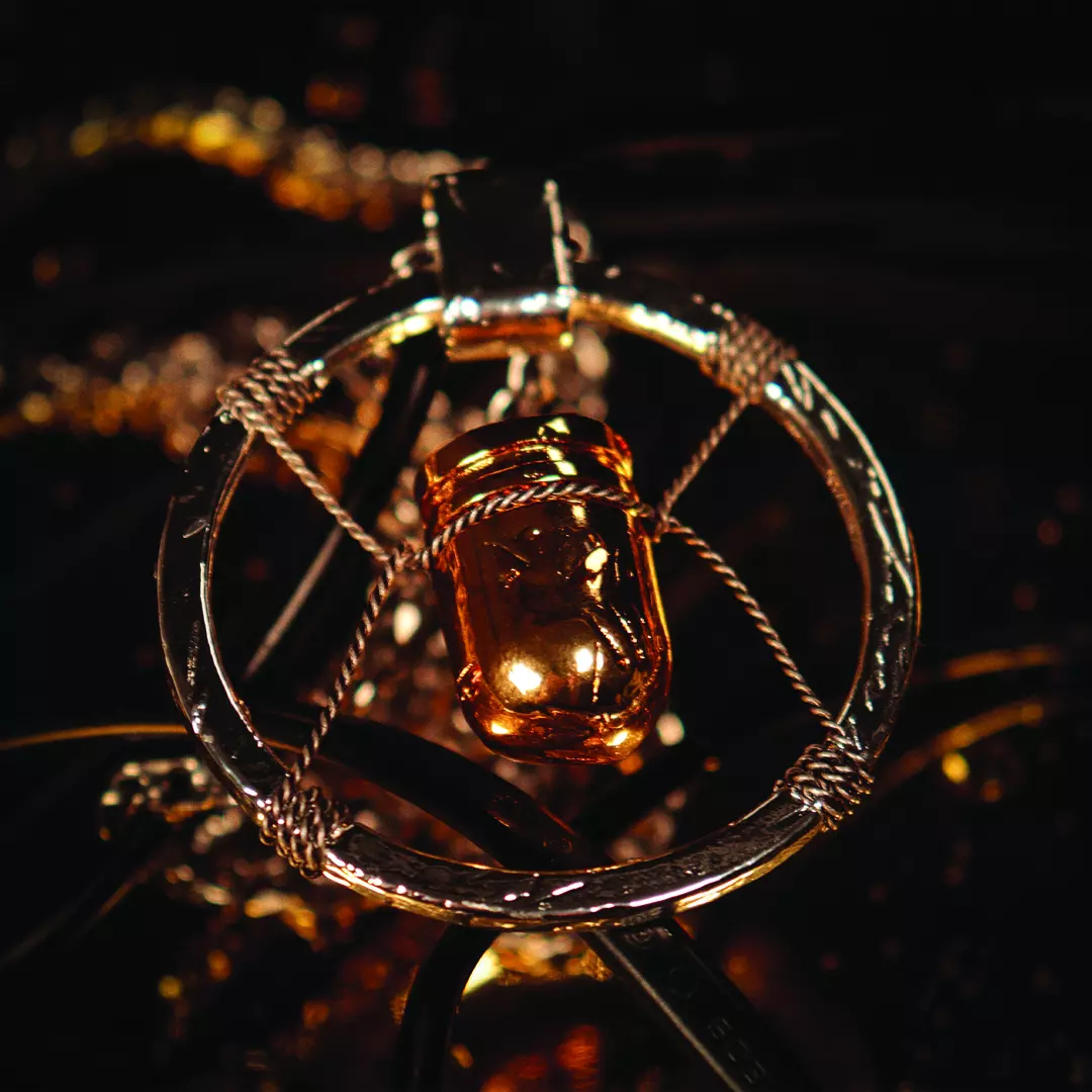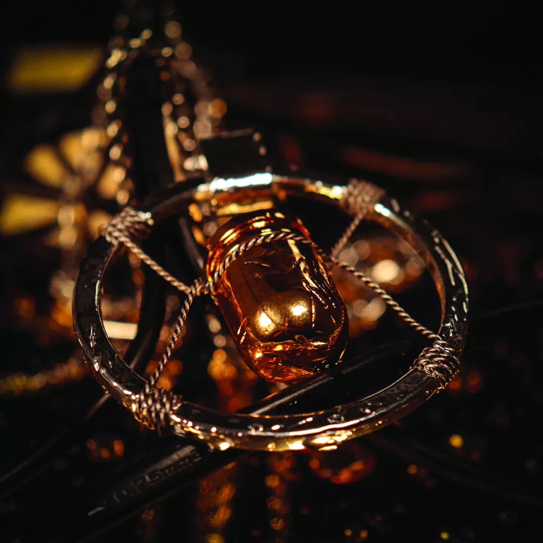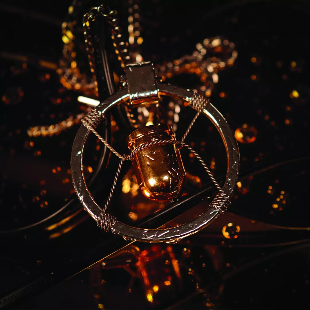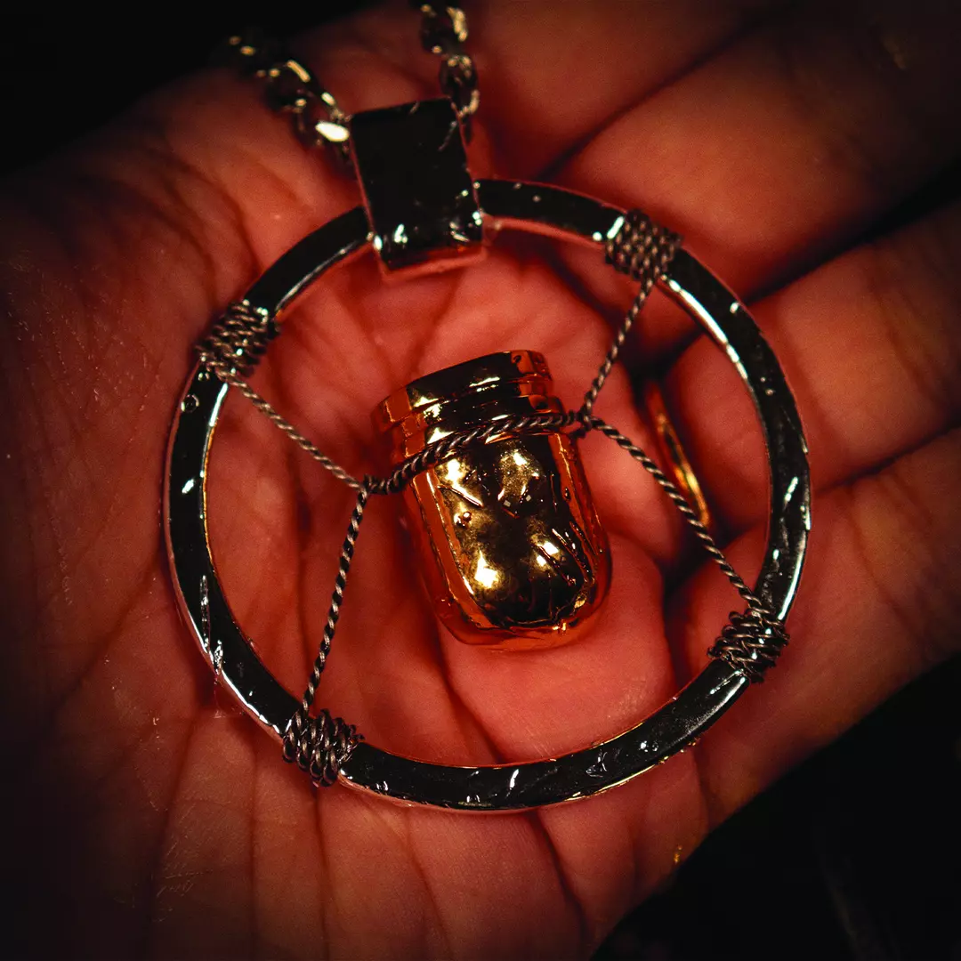 El icónico collar de V de Cyberpunk 2077 se presenta en esta réplica oficial con un diseño fiel y un acabado premium que captura la estética cruda y futurista de Night City. El colgante reproduce la bala característica del protagonista, suspendida dentro de un marco circular metálico que refuerza su simbolismo, mientras que la cadena aporta una presencia sólida y elegante. El contraste entre el dorado de la bala y el plateado del marco crea una pieza visualmente impactante y reconocible al instante para cualquier fan del universo Cyberpunk.