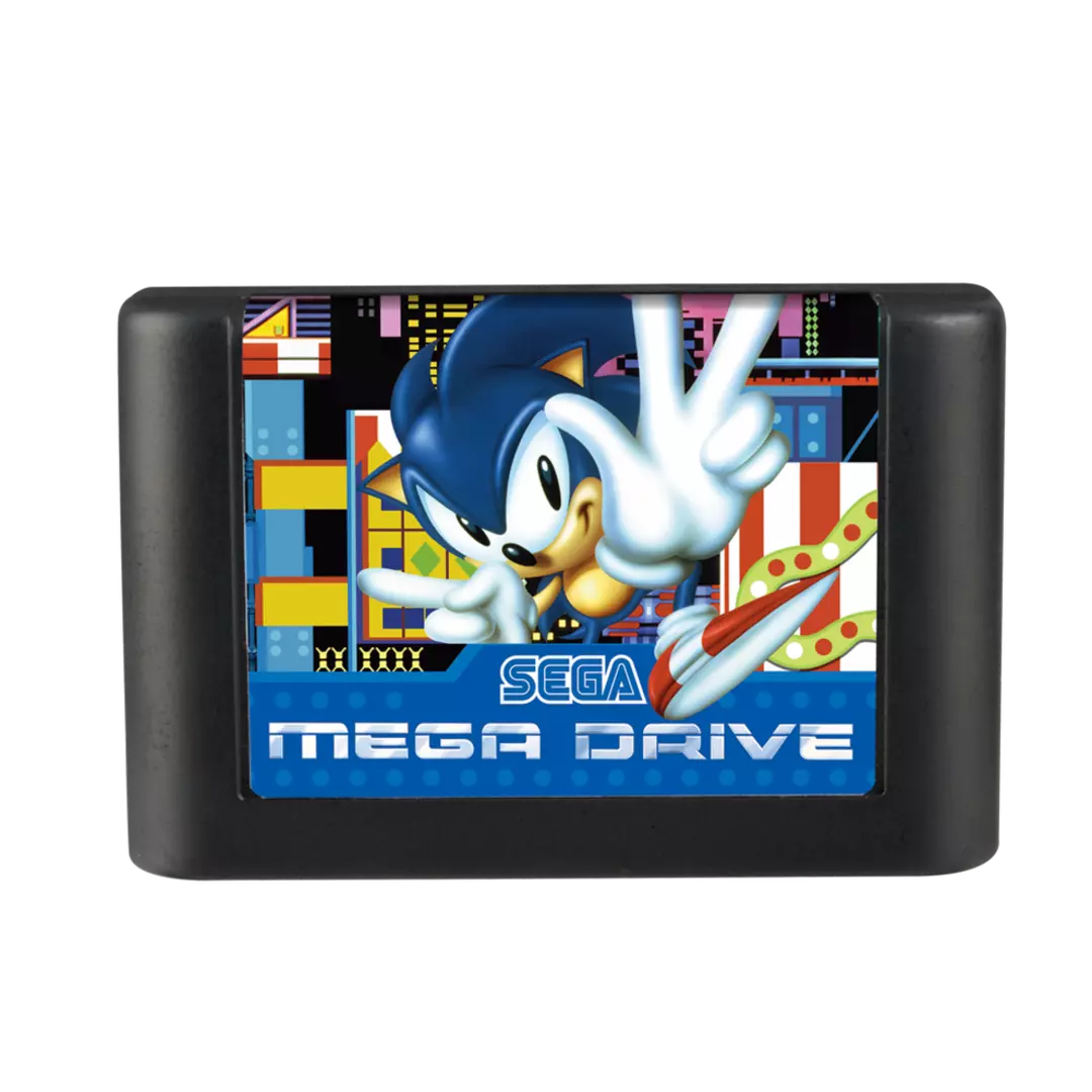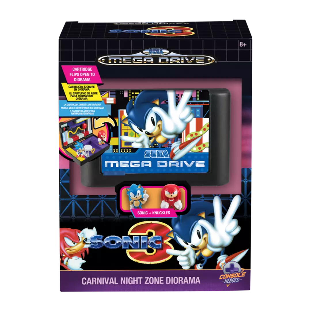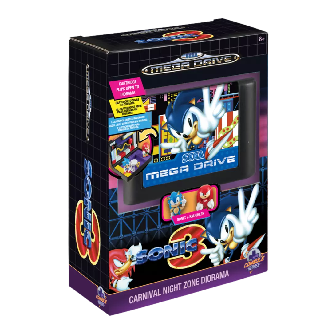 Diseño: Estilo híbrido entre cartucho retro y figura dinámica de Sonic, colores vibrantes y acabado nostálgico