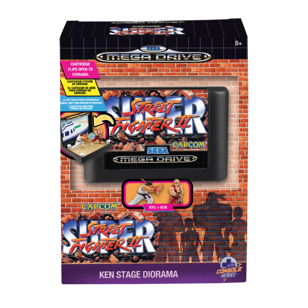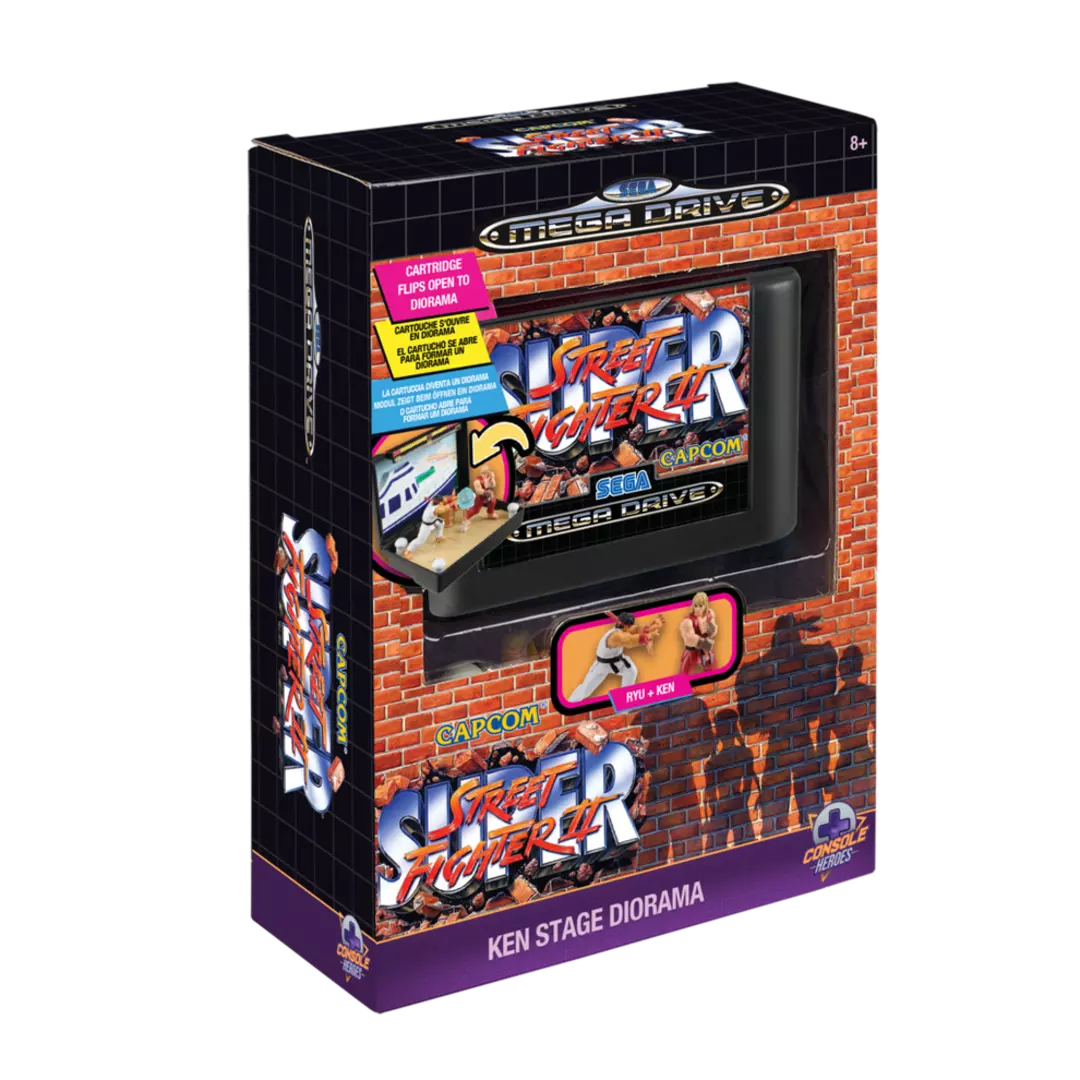 La leyenda de los juegos de lucha vuelve a cobrar vida con esta figura de Console Heroes inspirada en Super Street Fighter II para SEGA Mega Drive, uno de los títulos clave que definieron una era. Esta pieza convierte el icónico cartucho en un homenaje tridimensional repleto de dinamismo, presentando a Ryu en una pose cargada de fuerza y determinación, como si estuviera a punto de lanzar un Hadoken directamente desde la estantería. Los colores vibrantes, el toque retro y el estilo artístico a medio camino entre lo pixelado y lo moderno evocan de inmediato el espíritu competitivo que marcó a toda una generación de jugadores.