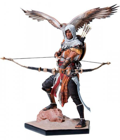 - Estatua de Bayek con águila, arco, escudo y espada inspiradas en el videojuego Assassin's Creed: Origins.