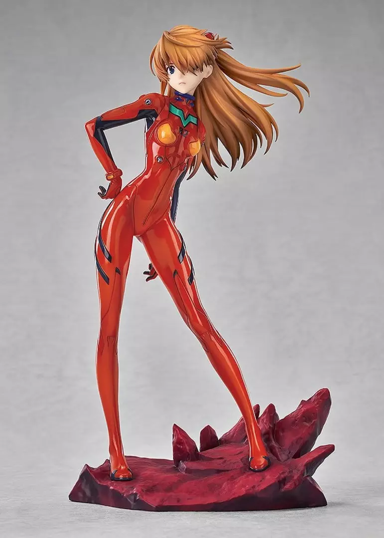 Asuka Shikinami Langley cobra vida en esta impresionante figura a escala 1/7 basada en Rebuild of Evangelion. Con su icónico plug suit rojo brillante y una pose firme y desafiante, esta pieza captura a la perfección su carácter decidido y su fuerte personalidad. El movimiento del cabello y la expresión intensa refuerzan la sensación de dinamismo, mientras que la base con acabado rocoso en tonos rojizos aporta un contraste visual espectacular. Diseñada para complementar la figura de Rei, ambas crean un conjunto equilibrado e imprescindible para los fans de la saga.