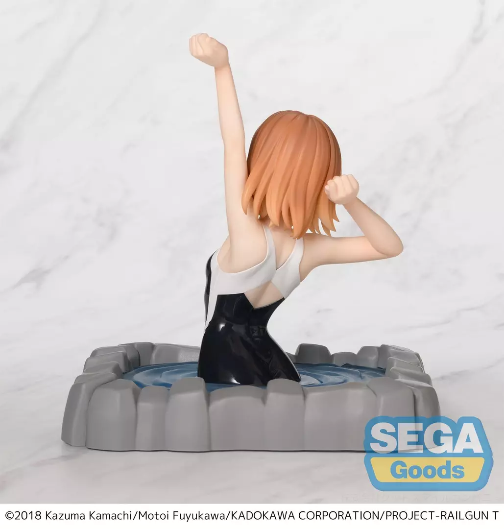 Mikoto Misaka se suma a la línea Thermae Utopia de Sega Goods con una escena fresca y desenfadada que muestra su lado más relajado. Representada dentro de un baño termal, con el clásico bañador negro brillante y una expresión guiñando un ojo mientras estira los brazos, esta figura captura perfectamente su personalidad enérgica y carismática. El efecto del agua y la base con acabado de piedra refuerzan la ambientación, creando una pieza diferente y llamativa dentro del universo Railgun.