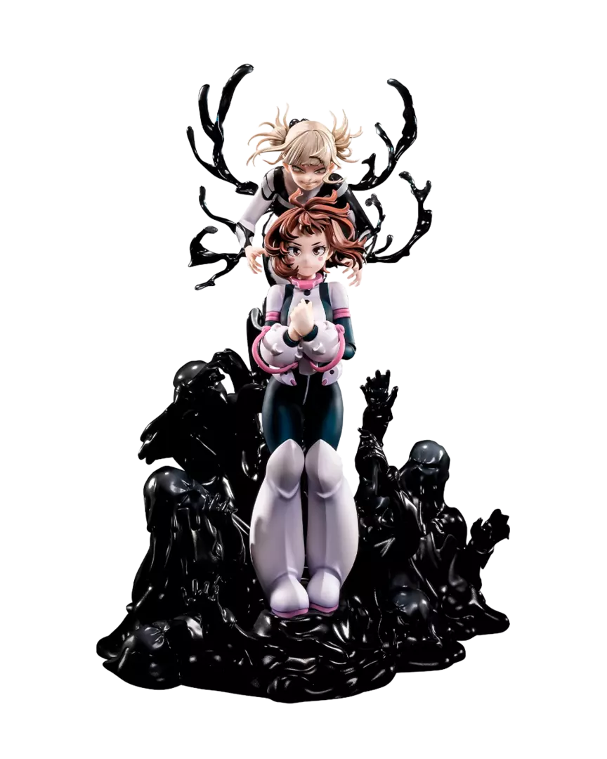 Esta espectacular figura de 24 cm reúne a Ochaco Uraraka y Himiko Toga en una composición dramática que simboliza el choque de ideales, emociones y destinos enfrentados. La base, formada por un oscuro remolino de siluetas emergentes, crea un contraste visual inmediato con el traje rosa y blanco de Ochaco, mientras Himiko aparece a su espalda con expresión inquietante y una postura tan elegante como perturbadora.