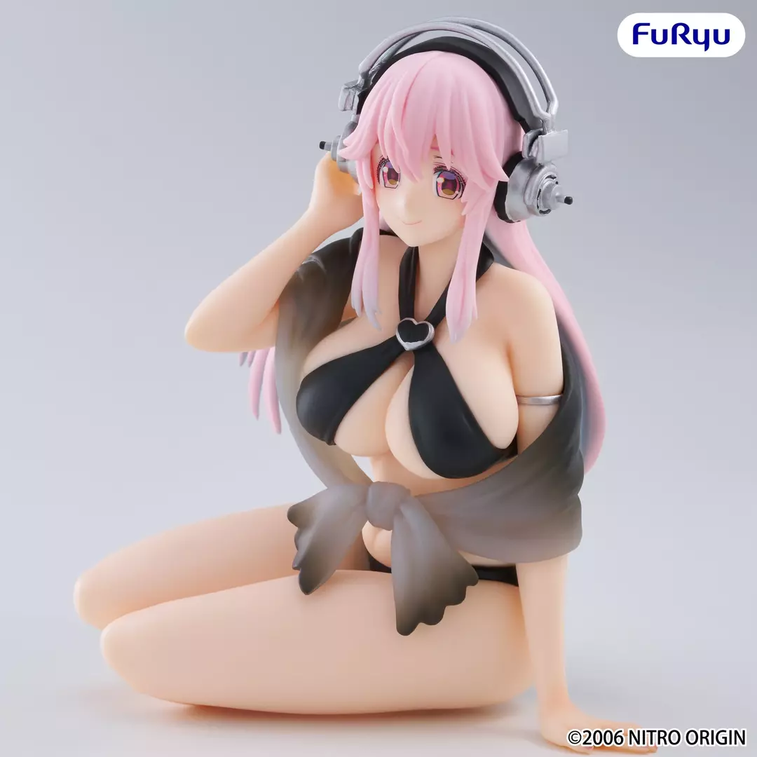 Super Sonico regresa en esta versión Swimsuit Black Color Ver. dentro de la línea Noodle Stopper de Furyu, mostrando su faceta más veraniega con un elegante bikini negro y sus icónicos auriculares. La pose sentada, relajada y con una expresión dulce, transmite cercanía y encanto, mientras el contraste entre el negro del conjunto y su característico cabello rosa crea una pieza visualmente muy atractiva y fácil de integrar en cualquier colección.