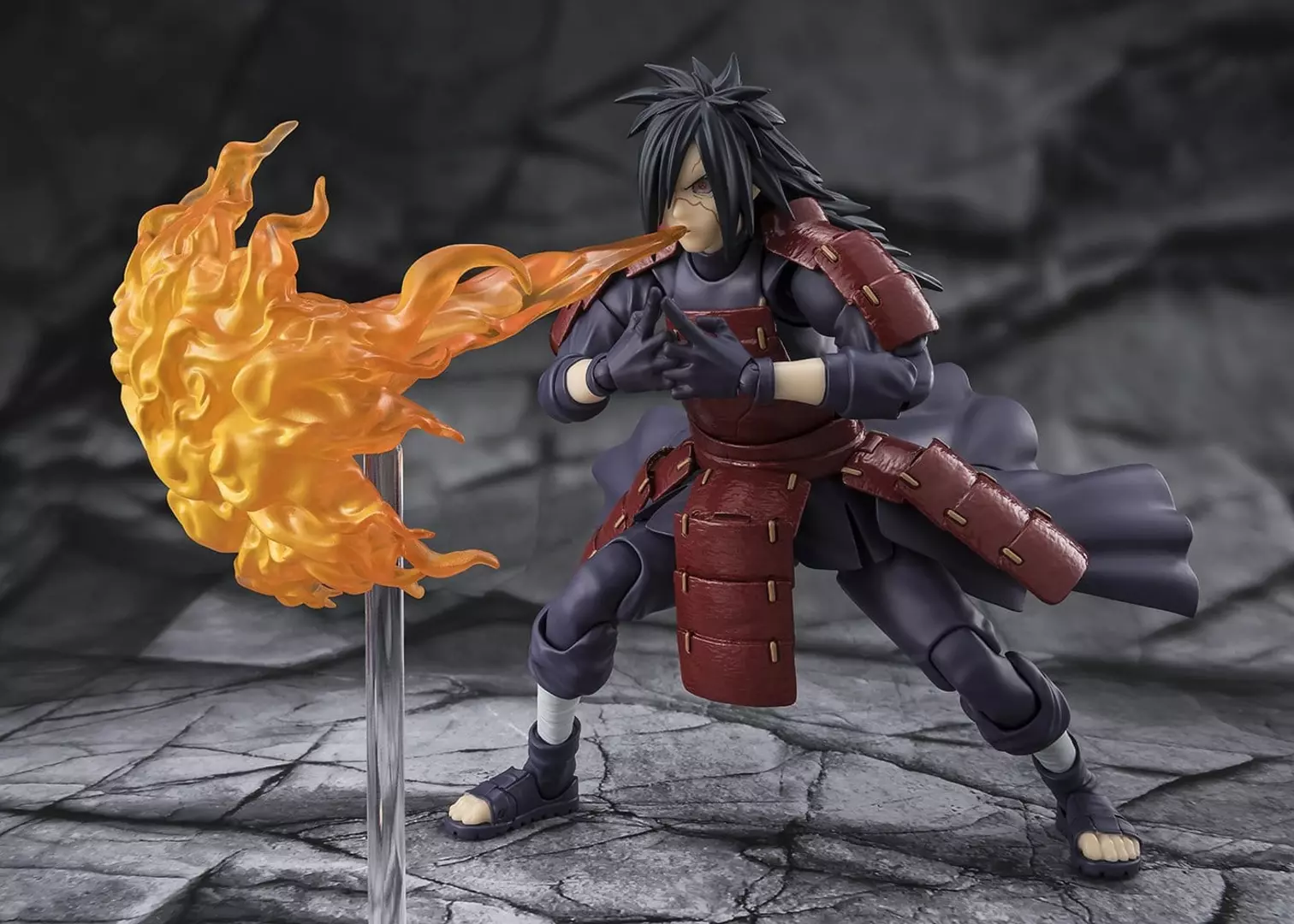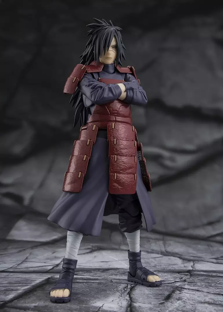 Uchiha Madara se presenta en esta figura de Naruto Shippuden dentro de la línea S.H.Figuarts Legend of Darkness con una presencia imponente que refleja su poder absoluto y su aura intimidante. El esculpido del rostro transmite frialdad y determinación, mientras que la armadura clásica del clan Uchiha, reproducida con gran fidelidad, refuerza su imagen de guerrero legendario. La pintura destaca los tonos oscuros del atuendo y los detalles de la armadura, logrando una representación sólida y fiel al personaje.