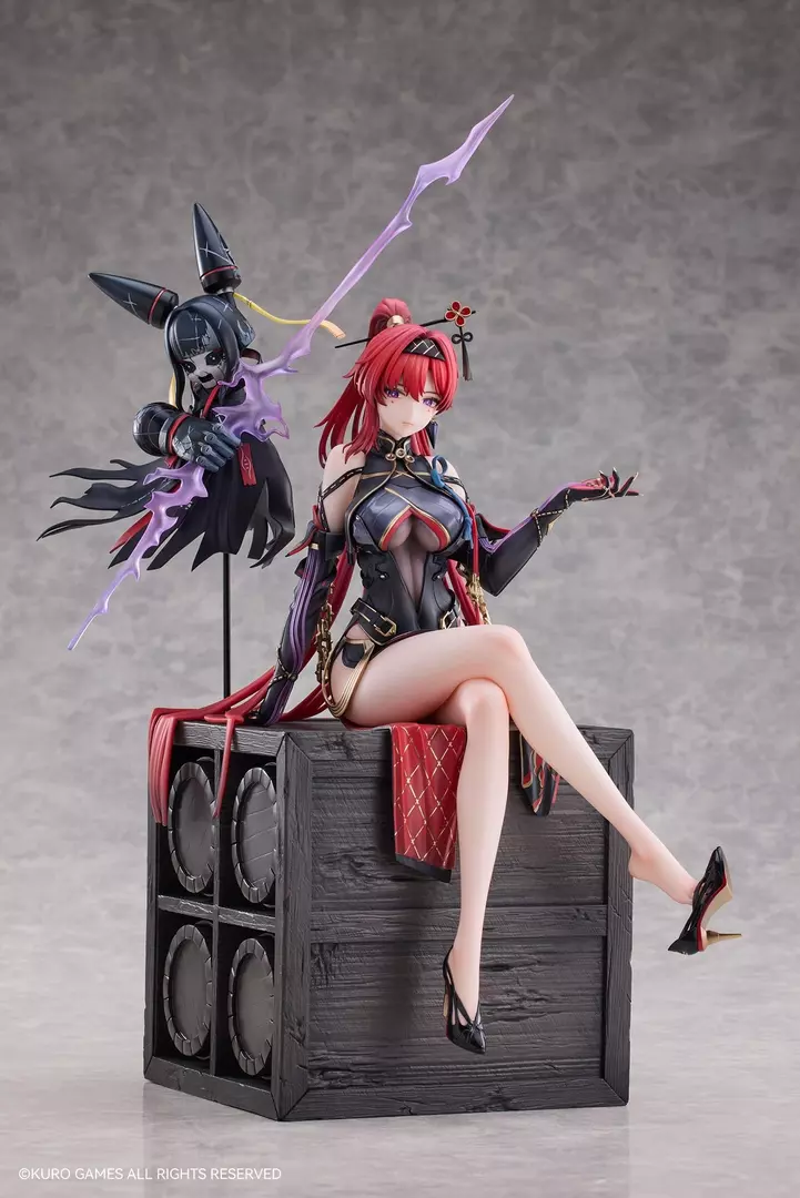 La enigmática Yinlin de Wuthering Waves se presenta en esta espectacular figura a escala 1/6 de Hannabee, una pieza que combina elegancia, peligro y presencia escénica en un formato de alto impacto. Sentada con actitud segura sobre una base tipo cofre, Yinlin irradia carisma y control, con una pose relajada pero provocadora que contrasta con la tensión implícita de su diseño. Su atuendo negro y carmesí, repleto de correas, transparencias y acabados metálicos, está recreado con un nivel de detalle excepcional, mientras que el esculpido de piernas, manos y rostro transmite una sensualidad refinada y una expresión fría y calculadora. La figura se complementa con su acompañante flotante y el efecto de energía púrpura, que añade dinamismo y refuerza su aura peligrosa y dominante.