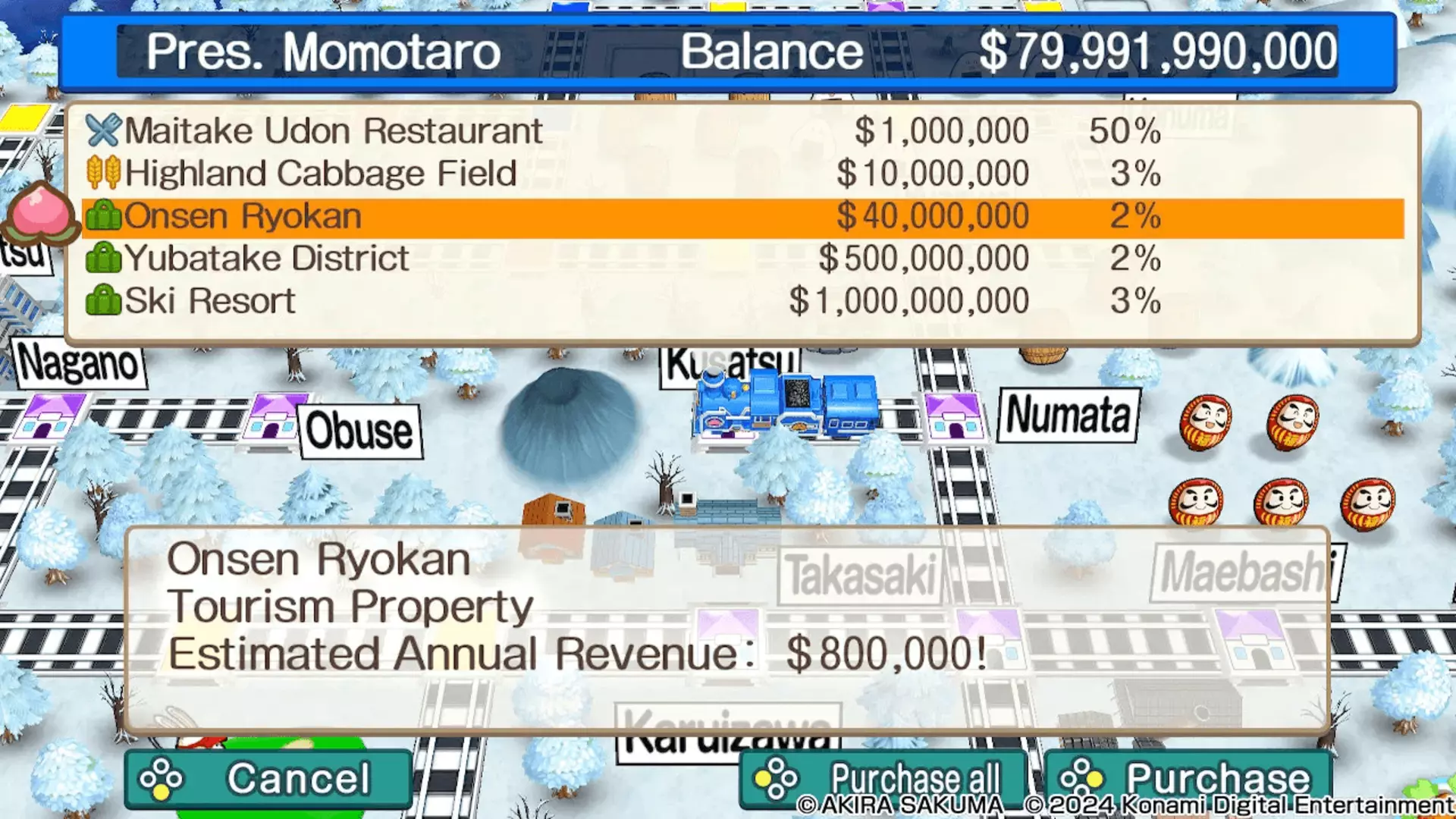 En Momotaro Dentetsu: Showa, Heisei, Reiwa mo Teiban!, los jugadores asumen el rol de presidente de una compañía ferroviaria y deben adquirir propiedades a lo largo de Japón con el objetivo de tener el mayor total de activos en el país.