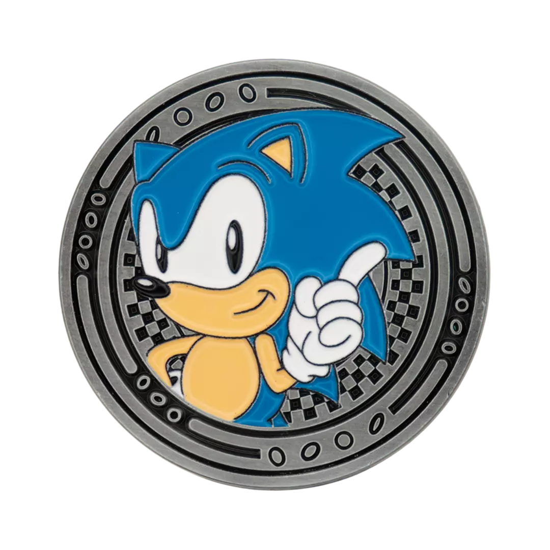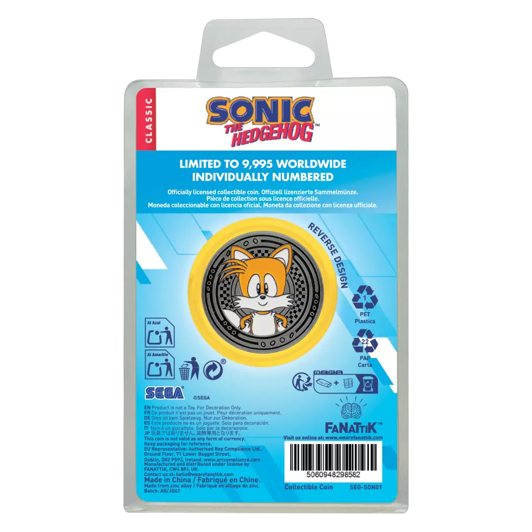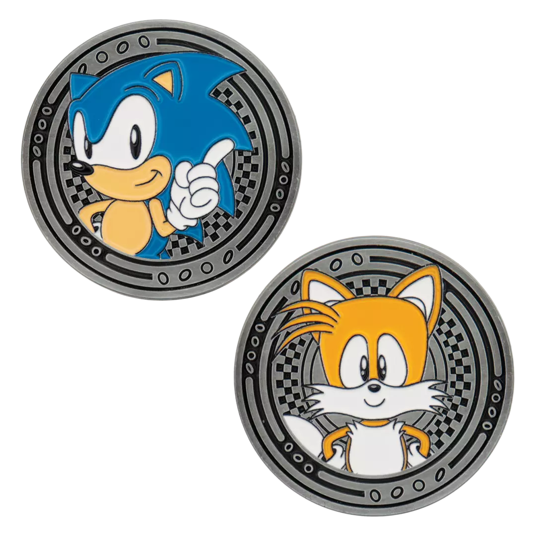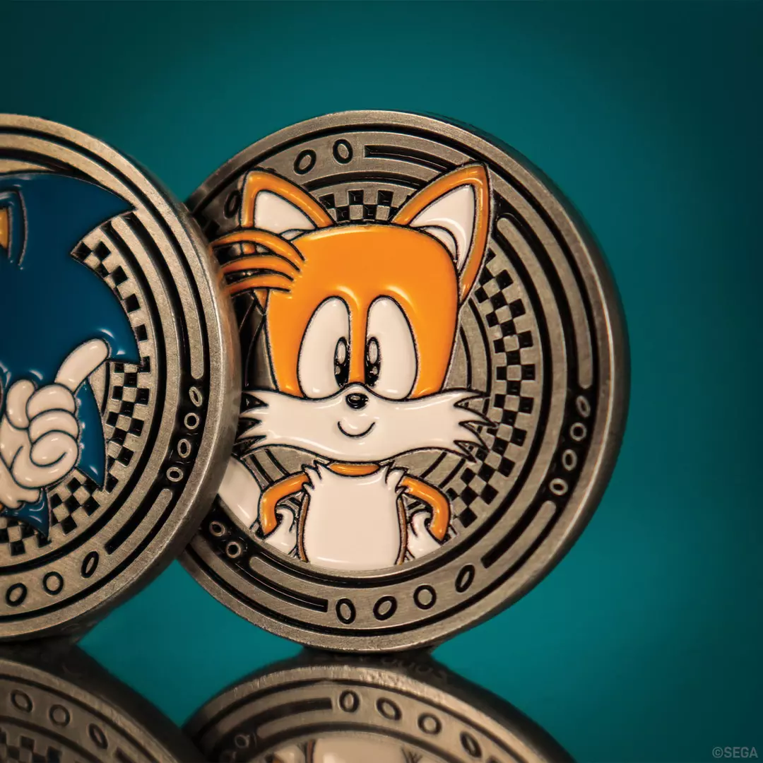 Con un acabado plateado, la moneda presenta a Sonic en el anverso y a Tails en el reverso, y está numerada en el canto como una de las 9995 unidades en todo el mundo.