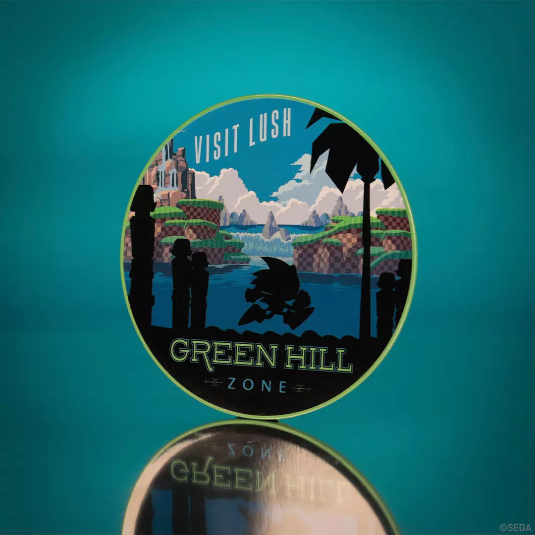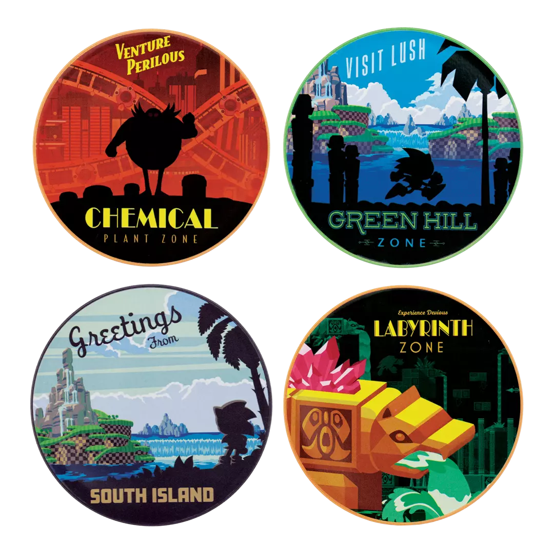 South Island, Chemical Plant Zone, Labyrinth Zone y, por supuesto, Green Hill: todas ellas son localizaciones icónicas del mundo de Sonic the Hedgehog y están representadas en este set de posavasos impresos. Fabricados en metal con base de corcho antideslizante, cada posavasos mide 89 mm de diámetro.