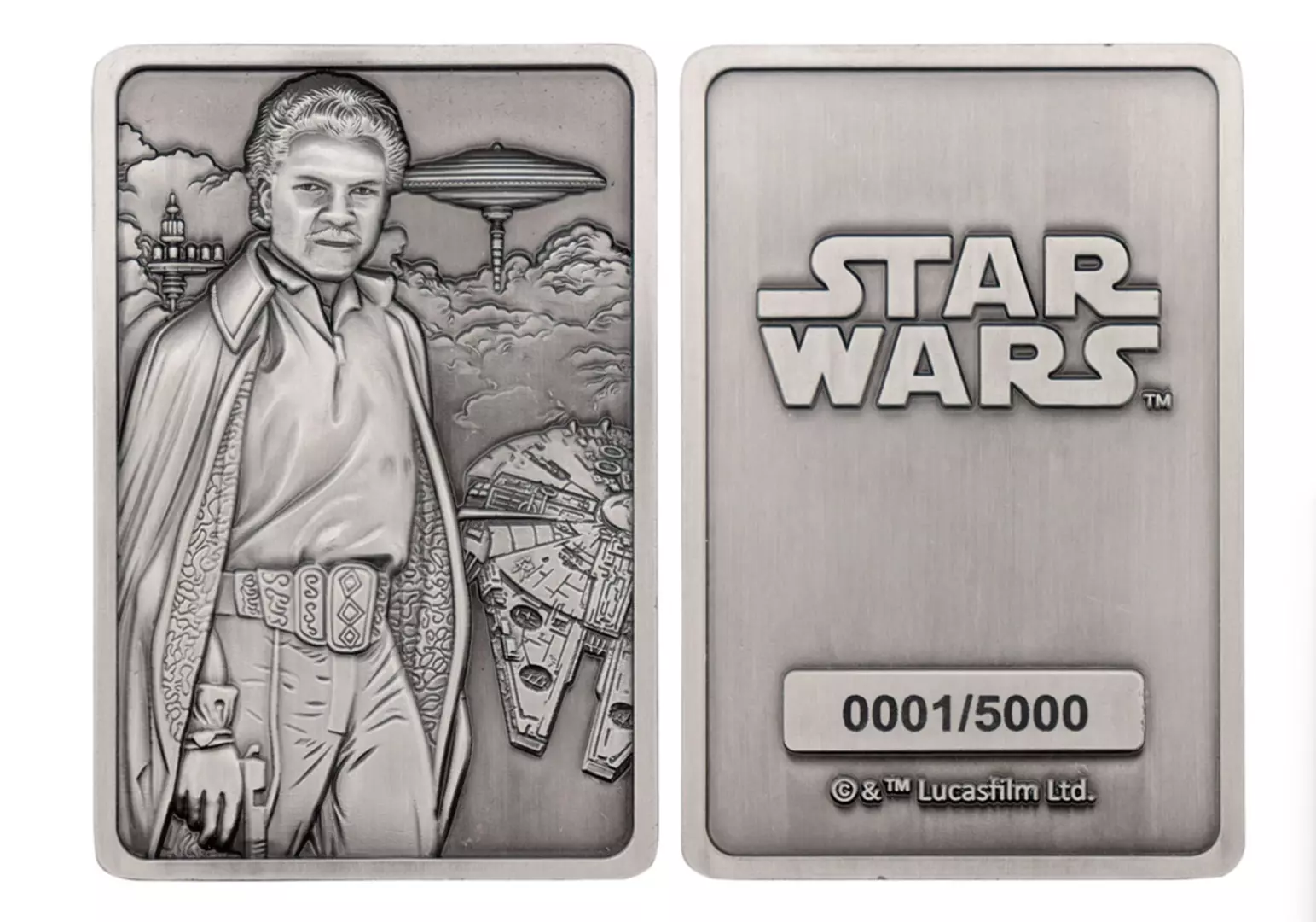 «¡Me vendría bien un copiloto!». Lando, tal como aparece en el Episodio V El Imperio contraataca, aporta su inconfundible carisma al universo Star Wars. Este lingote coleccionable de metal ha sido creado para celebrar a este singular y orgulloso custodio de Ciudad Nube, y presenta al Halcón Milenario, la ciudad y a Lando, todos ellos con un relieve profundo en su anverso. Limitado a 5.000 unidades en todo el mundo, cada lingote está numerado individualmente en el reverso e incluye un soporte para su cómoda exhibición.