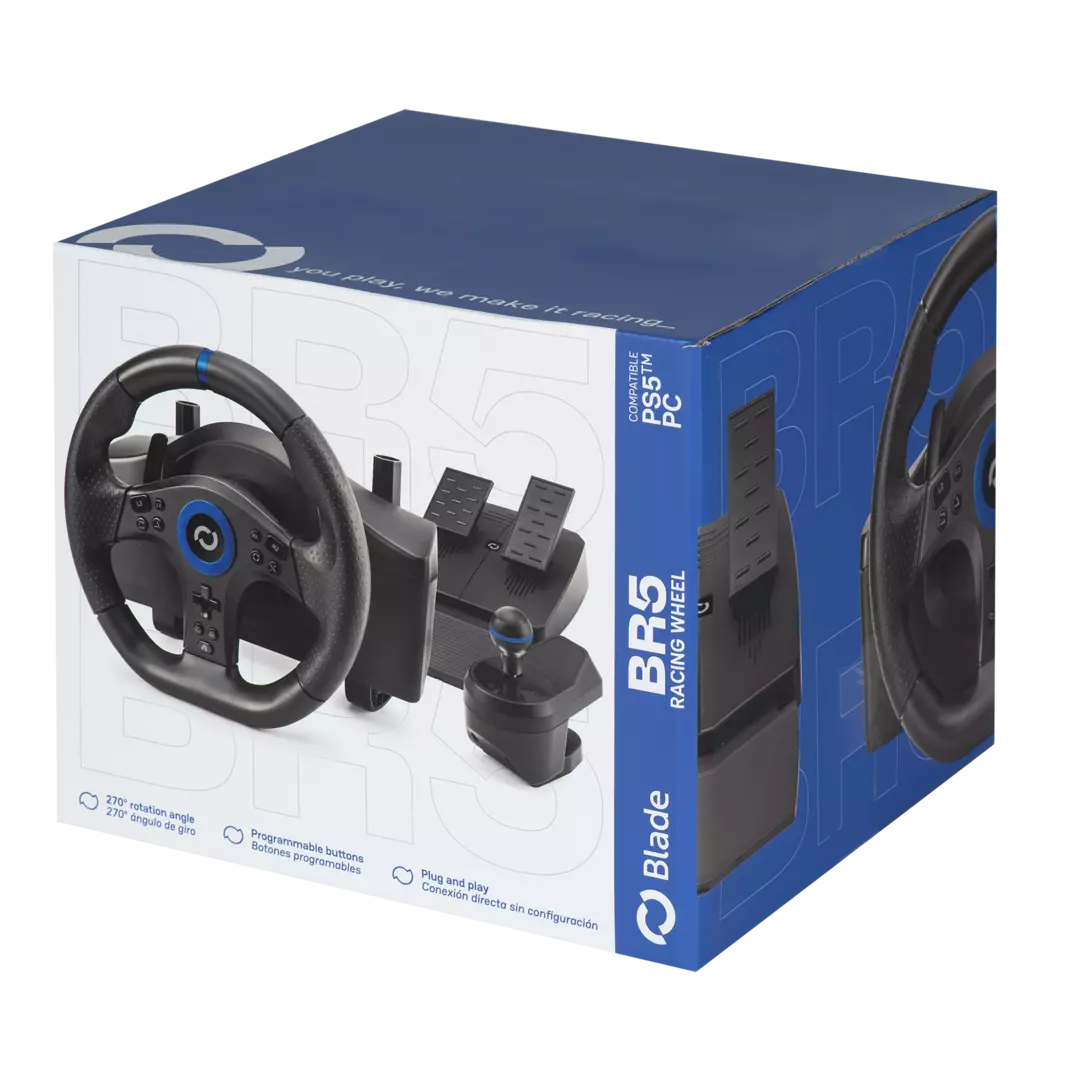 Gracias a su estructura robusta y a los pedales incluidos, el BR5 Wheel proporciona una conducción fluida y precisa, ideal para títulos de simulación y arcade. Su instalación es rápida y su compatibilidad total con los principales juegos de carreras de PS5 lo convierten en el accesorio perfecto para quienes buscan rendimiento profesional y emoción auténtica.